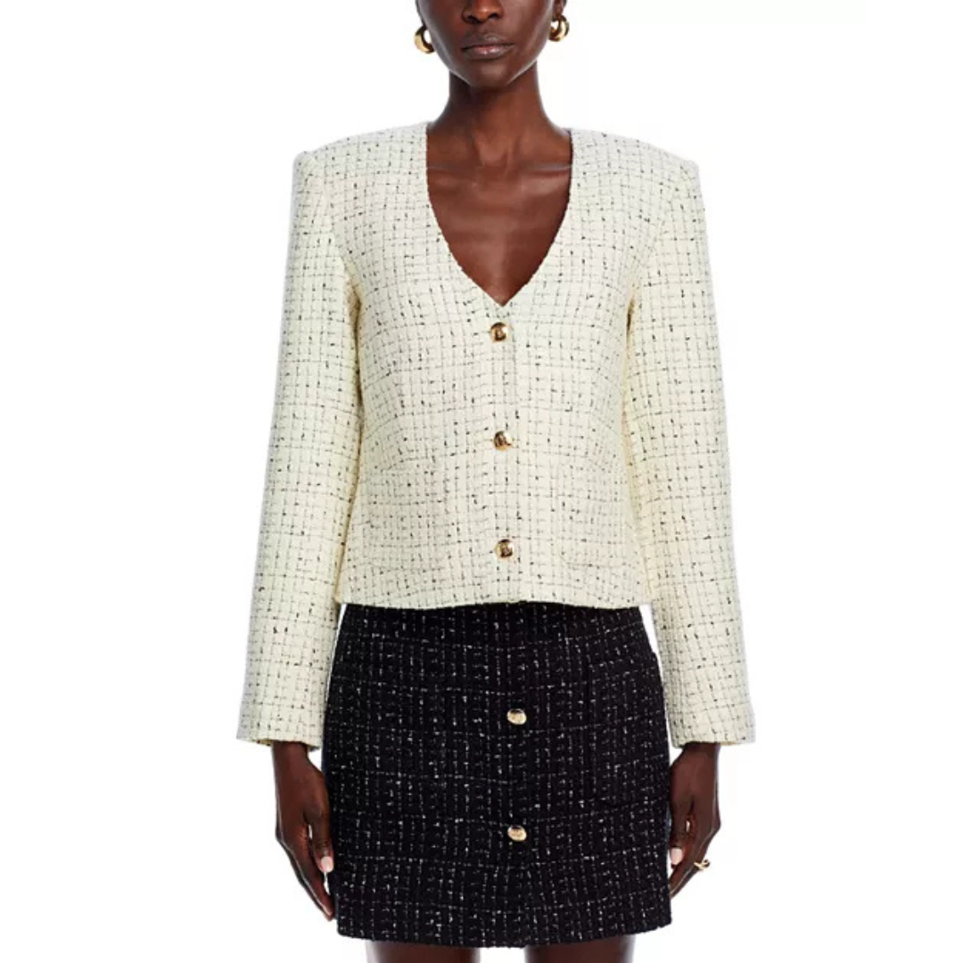 Channel Parisian cool-girl polish in the Anine Bing Anitta Tweed Jacket. Crafted in cream-and-black woven tweed, this cropped, structured silhouette features gold embossed statement buttons, padded shoulders, and a deep V-neckline. Fully lined and endlessly versatile, it’s perfect layered over denim, dresses, or tailored trousers for an elevated desk-to-dinner look.