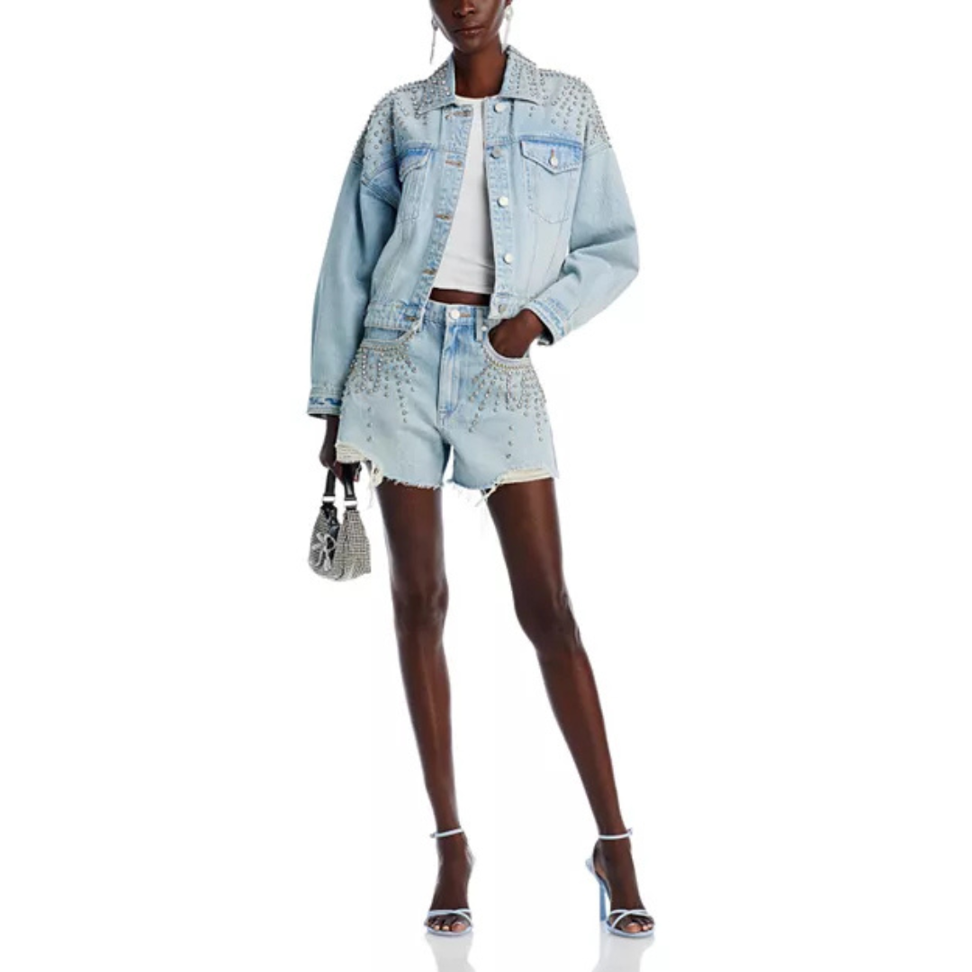 Light-wash BLANKNYC denim shorts in Starstruck feature glam silver-tone embellishments, frayed hems, and a flattering high-rise fit. Exclusive to Bloomingdale’s.